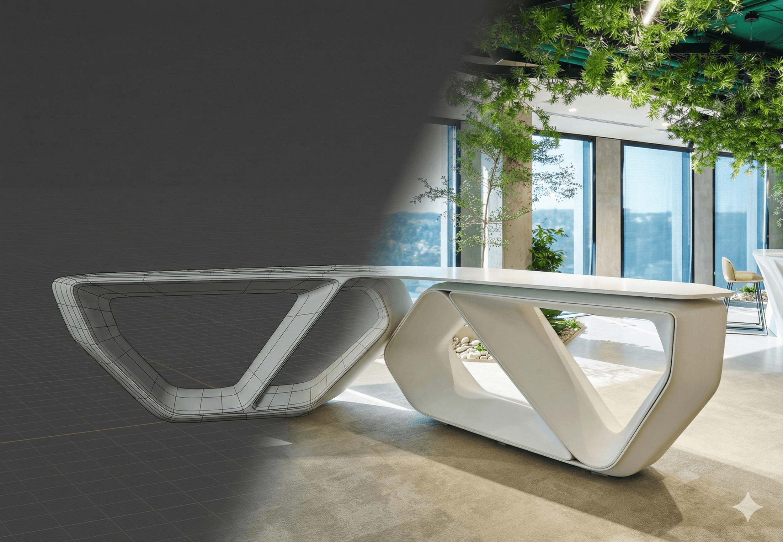 I employed a hybrid modeling strategy, utilizing SubD or NURBS geometry where most effective for each specific element. For the central sculptural bar, we developed a Grasshopper-based parametric system to refine the complex geometry and enable rapid design iterations. This approach allowed for precise control over the form while maintaining production feasibility, ensuring that the final geometry was fully optimized for large-scale robotic extrusion and could be adjusted quickly based on evolving design requirements.